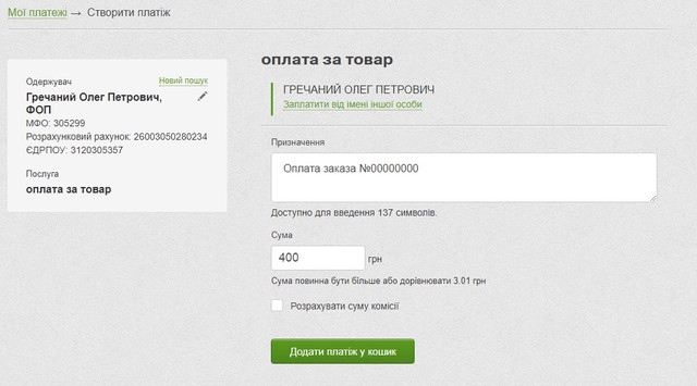 В призначенні платежу напишіть «Оплата за товар» і номер Вашого замовлення, там же вкажіть суму оплати і Ваше прізвище.