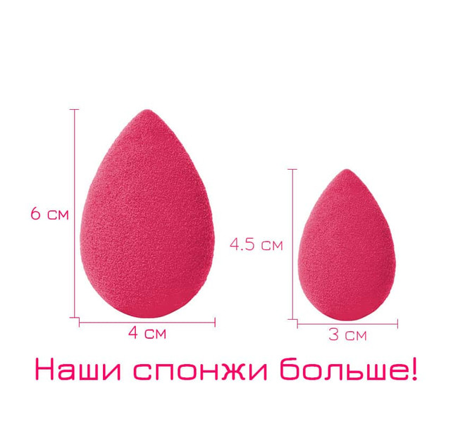 Унікальна форма – спонж виконаний у формі «яйця», за рахунок чого максимально зручно лежить в руці і не вислизає. У цієї форми є ще одна перевага: наносити косметичні засоби з зручністю тепер можна на великі зони і на важкодоступні. Широкою частиною наносите тональний крем на область щік, лоба, підборіддя, а звужену використовуйте в області очей або на крилах носа.